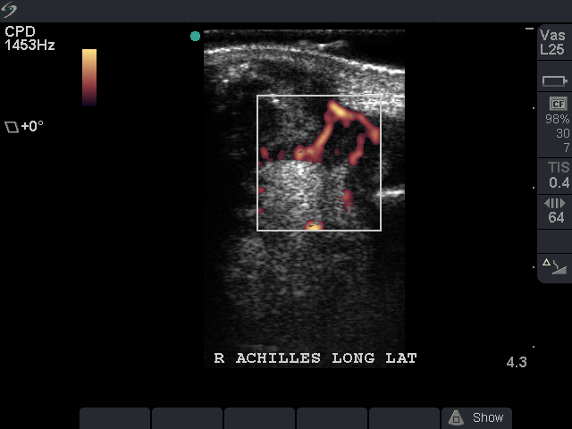Achilles Tendon: Power Doppler correlation depicting acute nature of swelling.