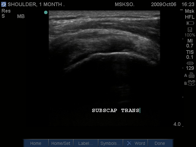 Anterior movement of the probe from the prior image shows beginning of cortical irregularities seen at the lateral Greater Tuberosity