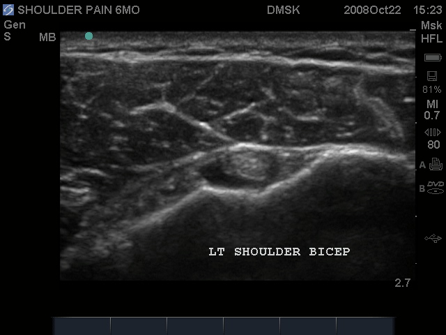 Supraspinatus Long axis: note the defect at the Greater Tuberocity surface. This image is taken at the mid long axis. It is important to sweep the probe anteriorly until the long axis bicep is seen.