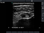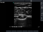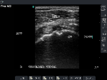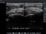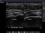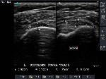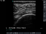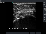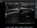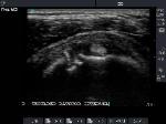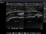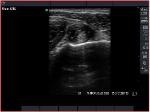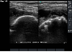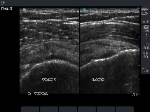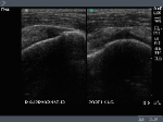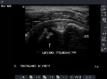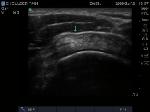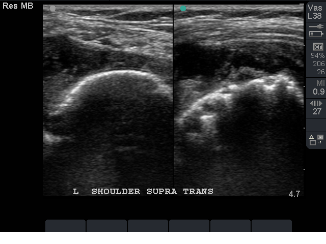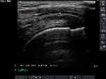 Distal Supraspinatus at its insertion, note the hypoechoic rim above the cortex is absent, image is now over the Greater Tuberocity. The defect in the tendon on this image is at the anterior margin of the tendon at the border of the biceps tendon.