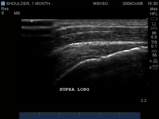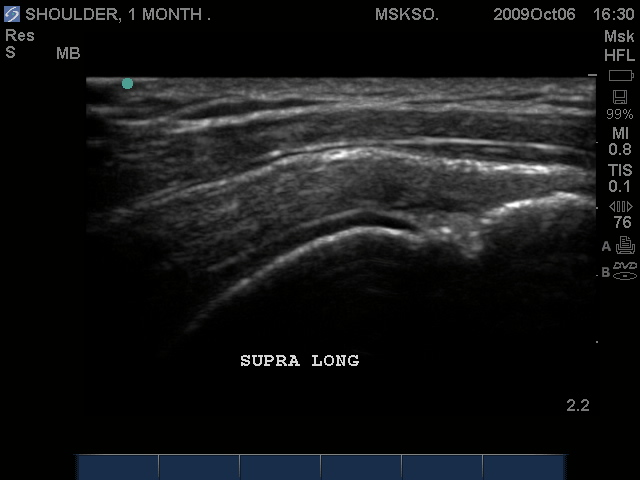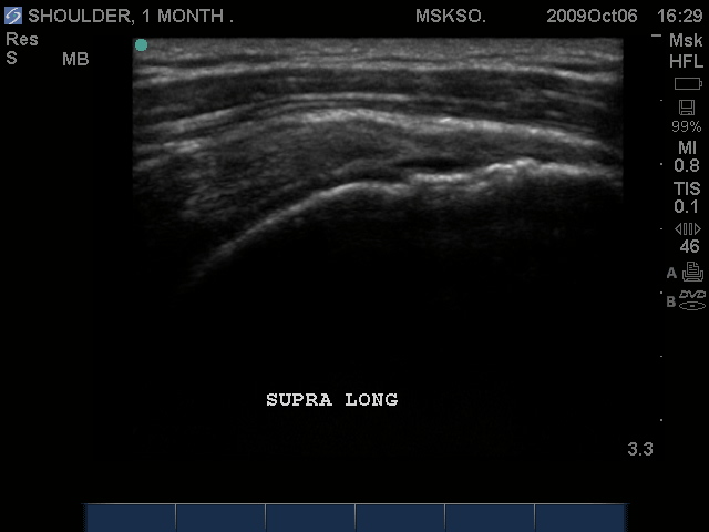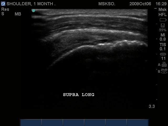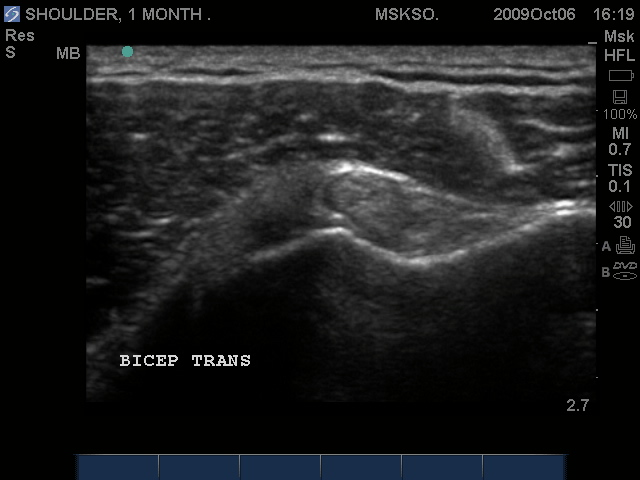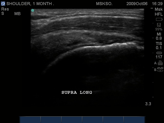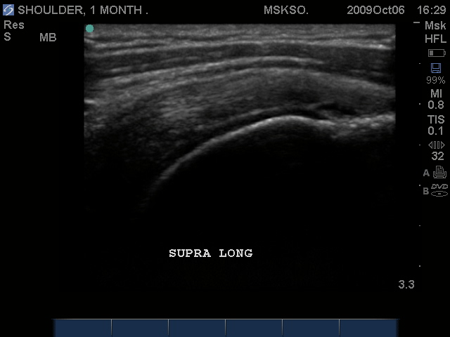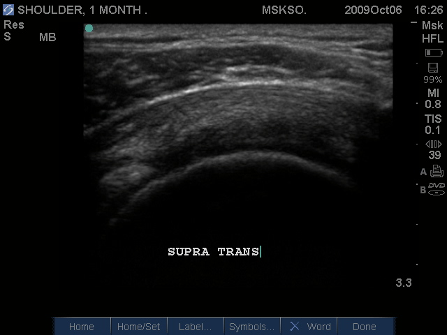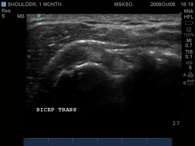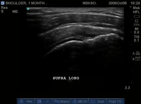 Supraspinatus tendon transverse over humeral head articular surface (articular surface changes in echotexture to hypoechoic)