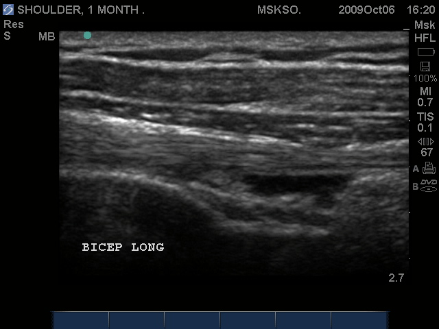 Long axis Bicep tendon with synovial fluid at level of surgical neck