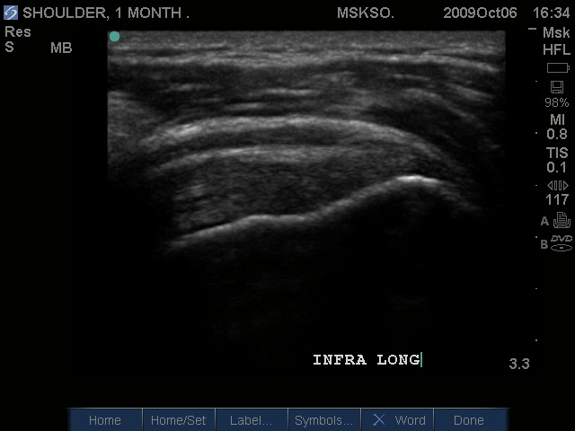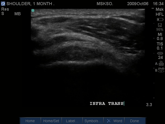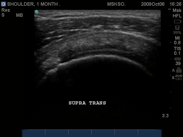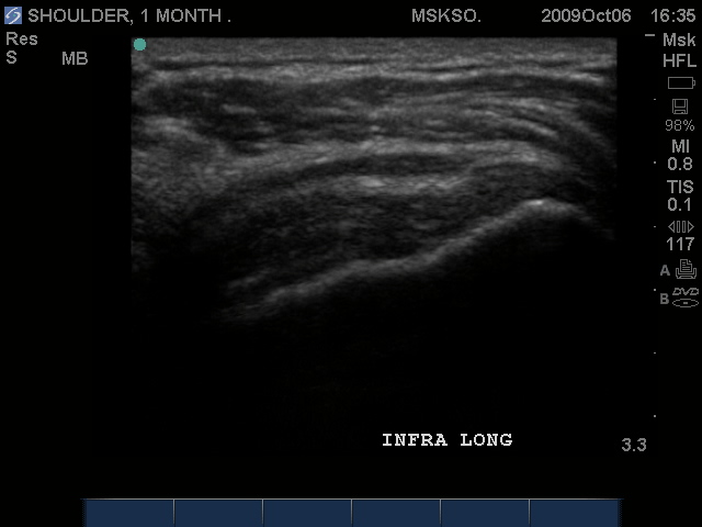 Posteriorly the Infraspinatus tendon in transverse plane is intact, but shows a bursitis that can be traced over the greater tuberosity. Proximal to this site this may be a normal myotendinous junction appearance.