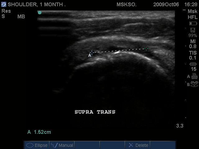 Supraspinatus imaged distally over the Greater Tuberosity. Large articular surface tear measured anterior to posterior, Infraspinatus tendon is seen at the right as a hyperechoic tendon transverse oblique over the posterior humeral head.