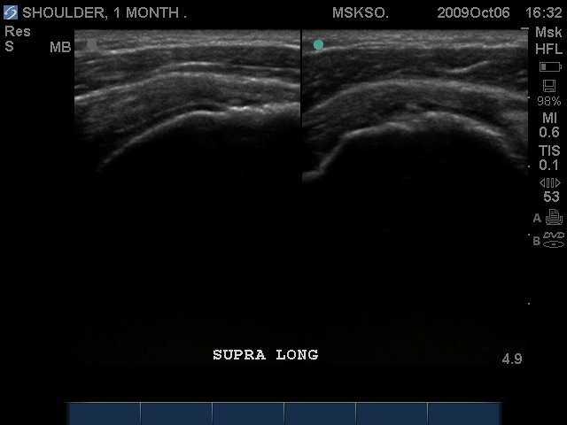 Compression of the tear site may reveal a more normal cuff appearance, in this case, the flattening of the normally convex appearing bursal surface would indicate that there is volume loss at this level.